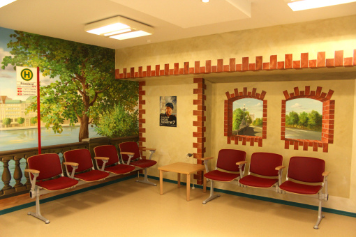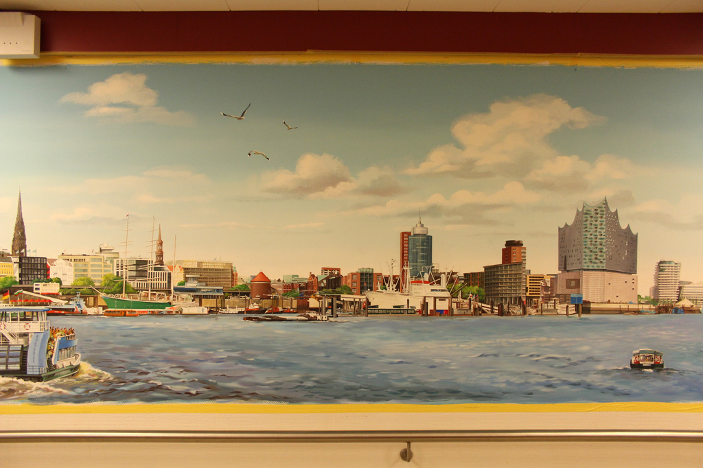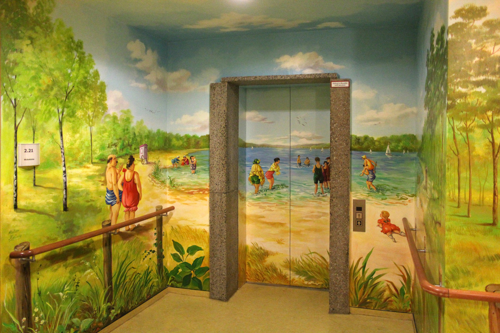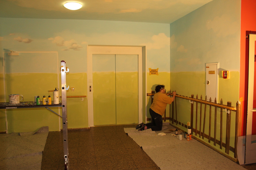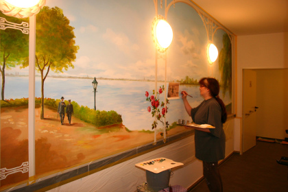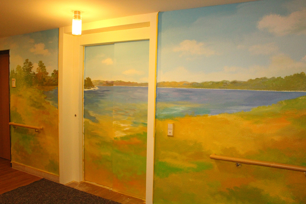 Gegebenheiten, wie Lampen, Handläufe oder Rollstuhlschutz lassen sich problemlos in das Motiv integrieren. Wenn Landschaften aus der direkten Umgebung gemalt werden sollen machen wir uns selber mit dem Fotoapparat auf den Weg, um auf Motivsuche zu gehen.