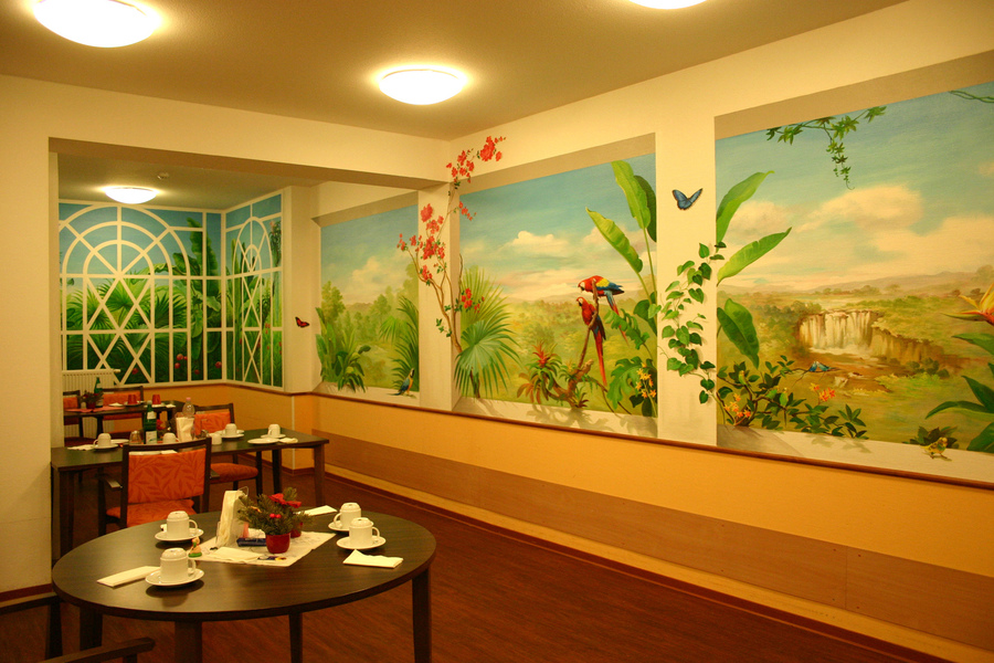 Endlose Flure, enge Aufenthalts-oder Speiseräume, Pflegebäder, die ungerne genutzt werden, überall gibt es Wände in Pflegeeinrichtungen, die durch Illusionsmalerei belebt werden können. Enge Räume können durch den Blick in eine schöne Landschaft erweitert werden, Zillemotive zaubern bei jedem Betrachter ein Lächeln aufs Gesicht, eine Ofenecke schafft Gemütlichkeit, es gibt unendlich viele Möglichkeiten, um auch der unattraktivsten Ecke ein bisschen Charme zu verleihen.